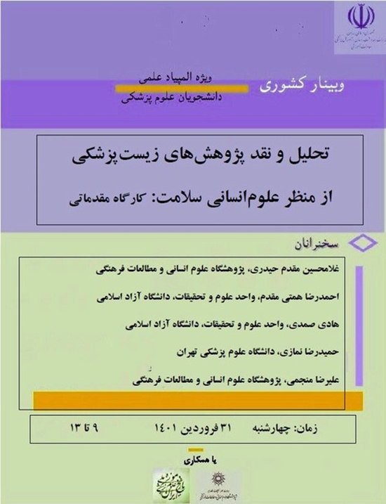 وبینار کشوری ویژه المپیاد علمی دانشجویان علوم پزشکی با همکاری موزه ملی تاریخ علوم پزشکی و پژوهشگاه علوم انسانی و مطالعات فرهنگی کشور، تاریخ 31 فروردین 1401 از ساعت 9تا 13 برگزار می شود.
